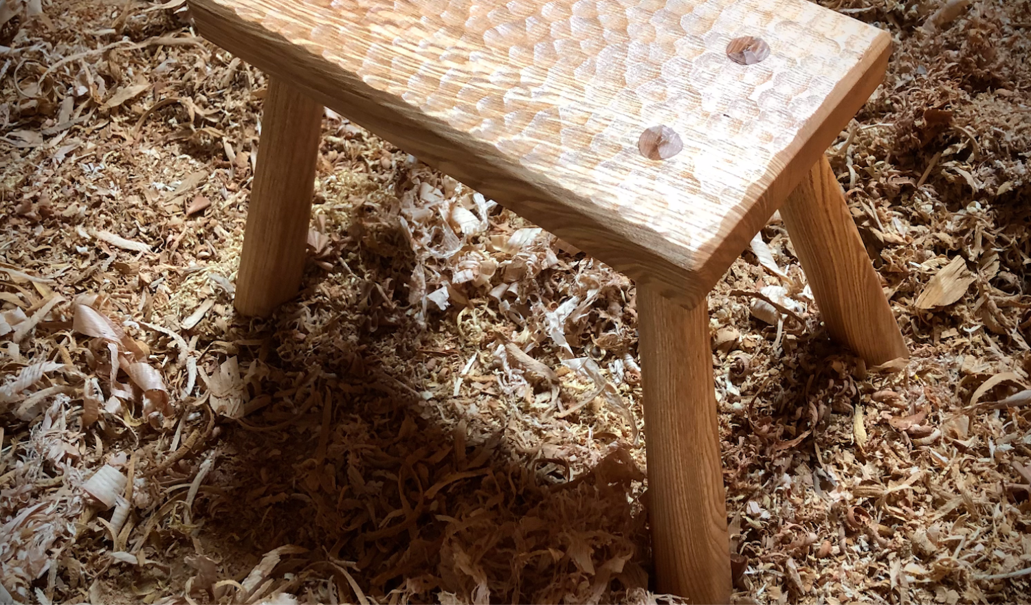 The joinery is simple, strong and resilient. The legs are driven or staked into holes bored on the underside of the seat top. More often these holes are tapered to match a taper on the leg.